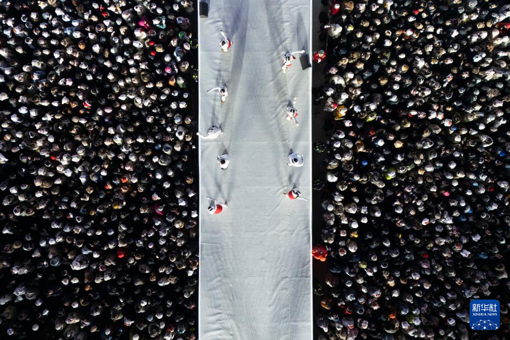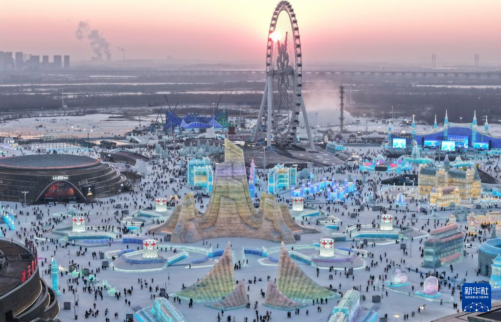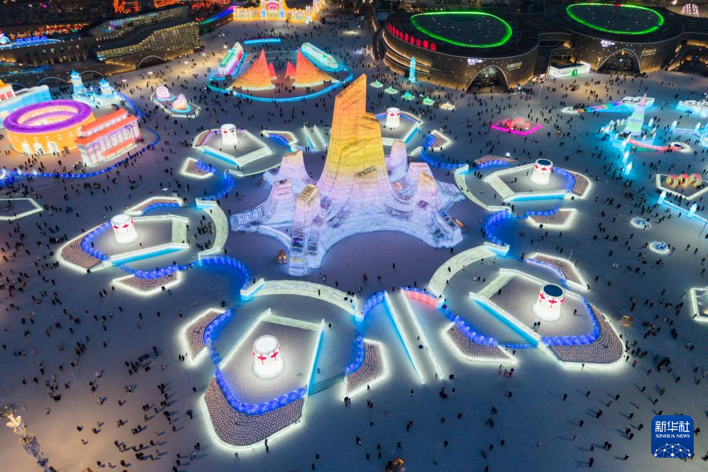 12月17日,游客在哈爾濱冰雪大世界園區(qū)游玩(無(wú)人機(jī)照片)。新華社記者 張濤 攝