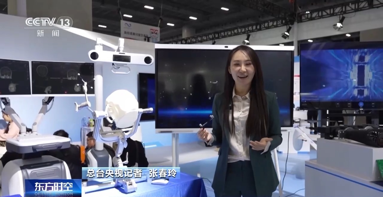 總臺央視記者 張春玲:這是一個手術(shù)機(jī)器人的展位,旁邊是神經(jīng)外科手術(shù)的導(dǎo)航系統(tǒng),通過光學(xué)定位相機(jī),醫(yī)生可以在提前已經(jīng)建模好的手術(shù)導(dǎo)航當(dāng)中,通過現(xiàn)場的精準(zhǔn)的定位來對手術(shù)進(jìn)行一個實(shí)時的導(dǎo)航。