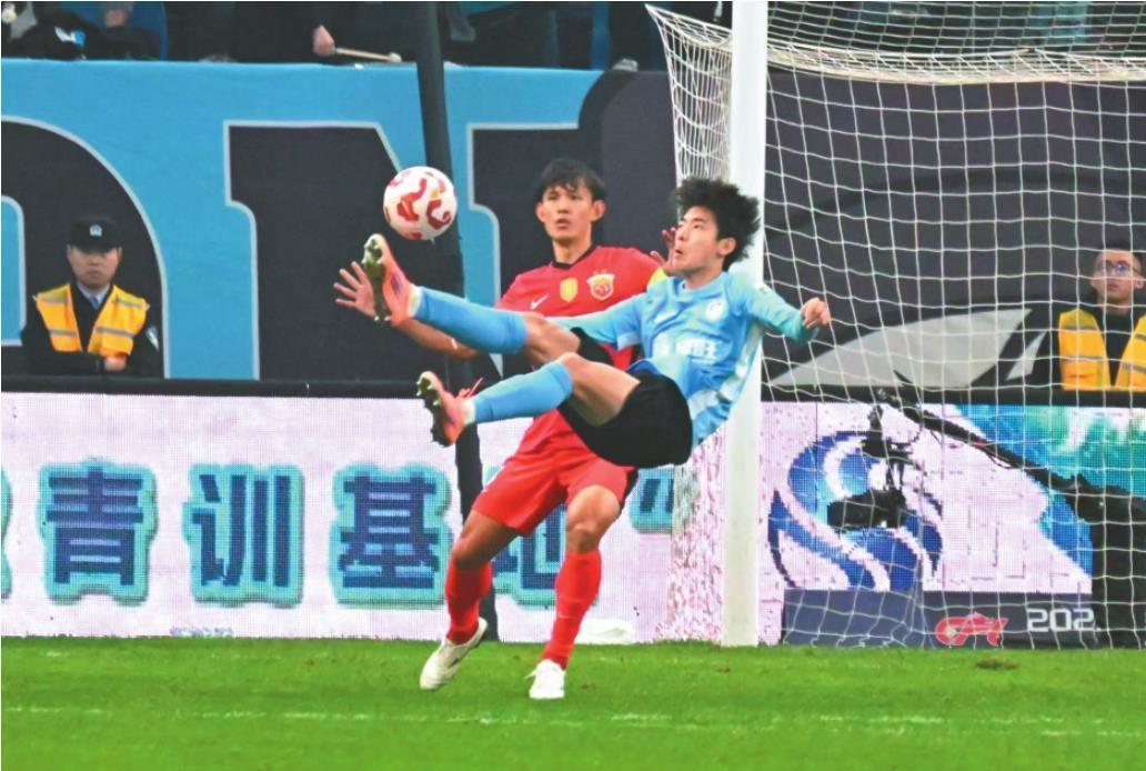 英博海發(fā)隊球員朱鵬宇(前)倒鉤射門。 遼寧日報記者 孫海濤 攝