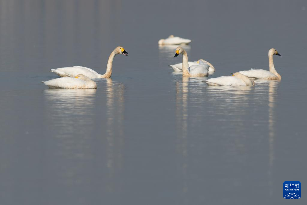 12月16日,天鵝等候鳥在安徽省滁州市明湖公園的水面上休憩、游弋。新華社記者 張端 攝