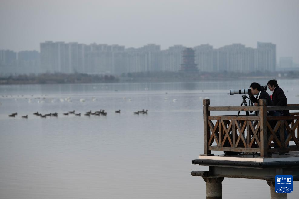 12月16日,在安徽省滁州市明湖公園,攝影愛好者拍攝候鳥。新華社記者 張端 攝