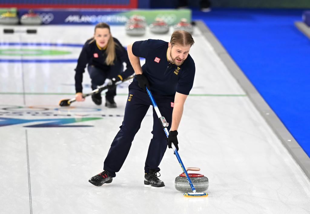 2月4日,瑞典隊選手拉斯穆斯·弗拉納(前)和伊莎貝拉·弗拉納在對陣韓國隊的比賽中。新華社記者 連漪 攝