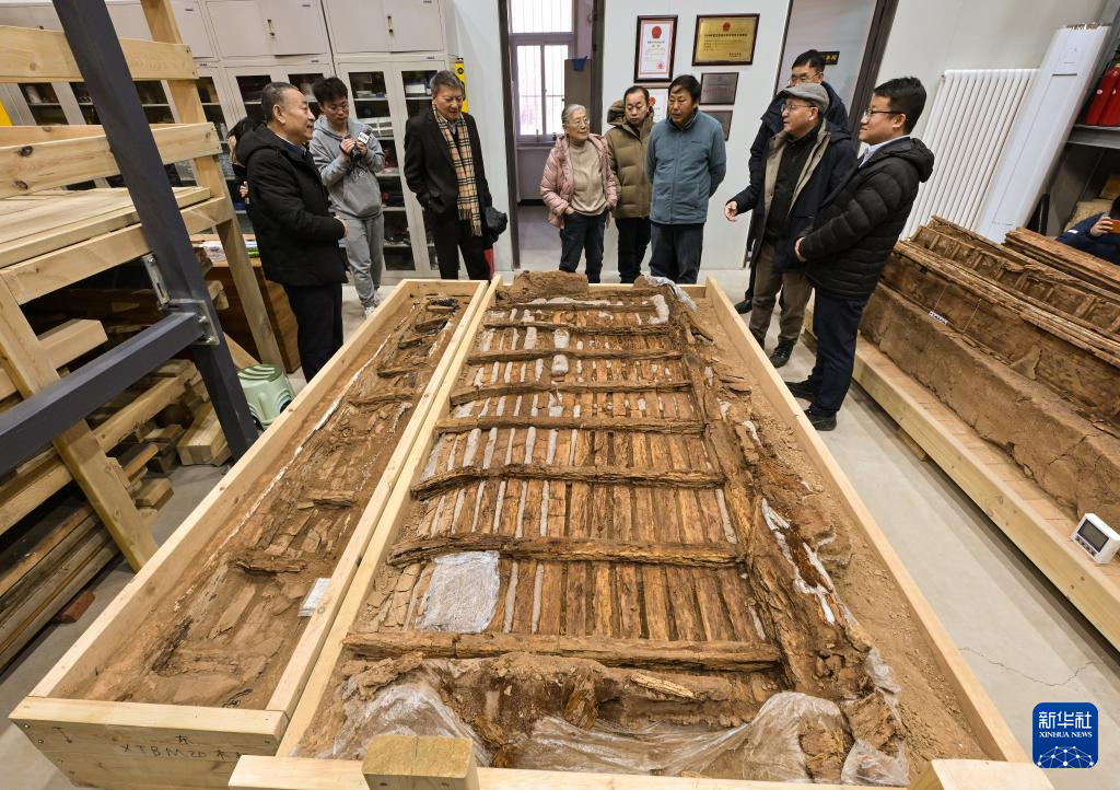 專家們?cè)趯?shí)驗(yàn)室考古方艙內(nèi)察看墓葬M20出土的完整木榻(2月1日攝)。新華社記者 李賀 攝