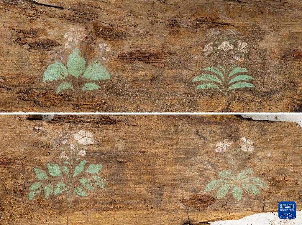 拼版照片:這是在實(shí)驗(yàn)室考古方艙內(nèi)拍攝的墓葬M20出土棺板上的彩繪花卉圖案(2月1日攝)。新華社記者 李賀 攝