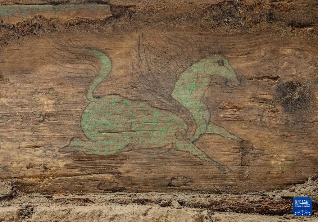 這是在實(shí)驗(yàn)室考古方艙內(nèi)拍攝的墓葬M20出土的木棺座壸門內(nèi)的彩繪“翼馬”圖案(2月1日攝)。新華社記者 李賀 攝