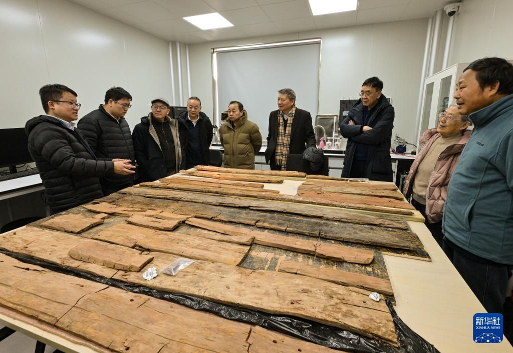 專家們?cè)趯?shí)驗(yàn)室考古方艙內(nèi)察看墓葬M20出土的帶有彩繪和文字的木屏風(fēng)(2月1日攝)。新華社記者 李賀 攝