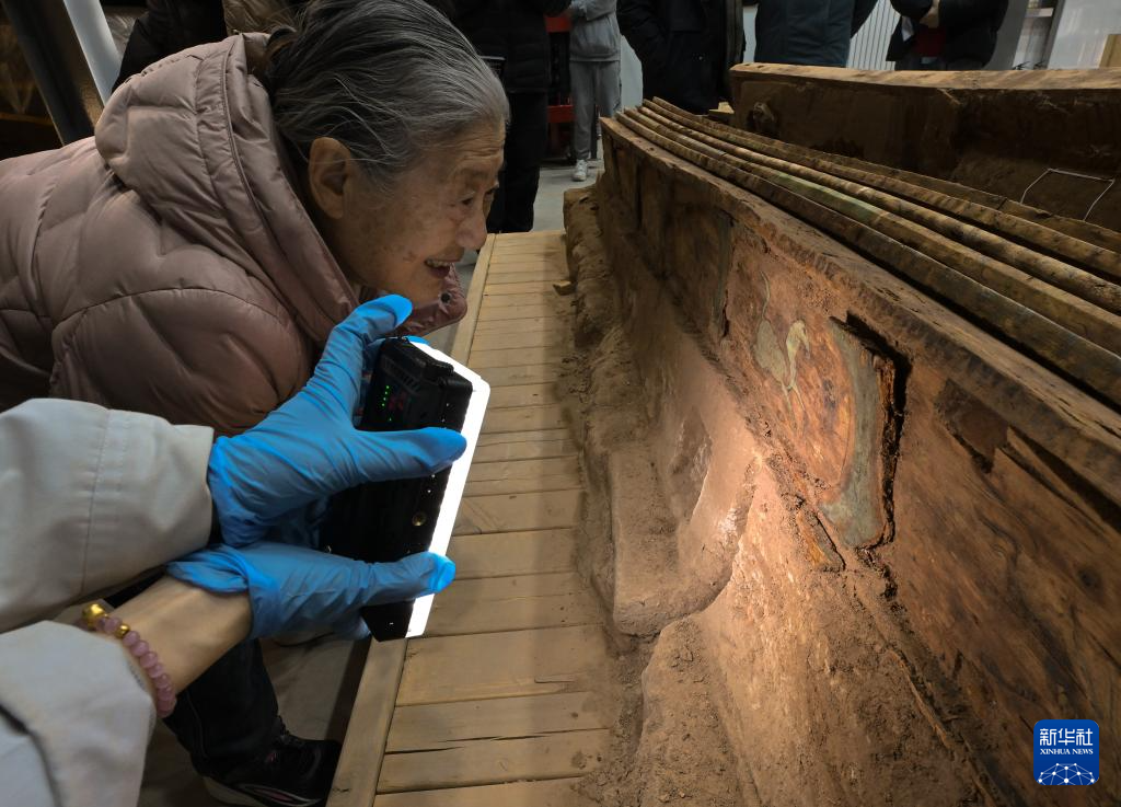 中國社會(huì)科學(xué)院科技考古與文化遺產(chǎn)保護(hù)重點(diǎn)實(shí)驗(yàn)室副研究員劉勇(左一)在實(shí)驗(yàn)室考古方艙內(nèi)向?qū)<覀兘榻B墓葬M20出土的木棺彩繪情況(2月1日攝)。新華社記者 李賀 攝