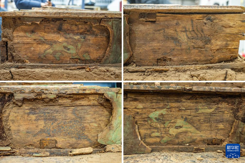 拼版照片:這是在實(shí)驗(yàn)室考古方艙內(nèi)拍攝的墓葬M20出土棺座上壸門內(nèi)的彩繪“瑞獸”圖案(2月1日攝)。新華社記者 李賀 攝