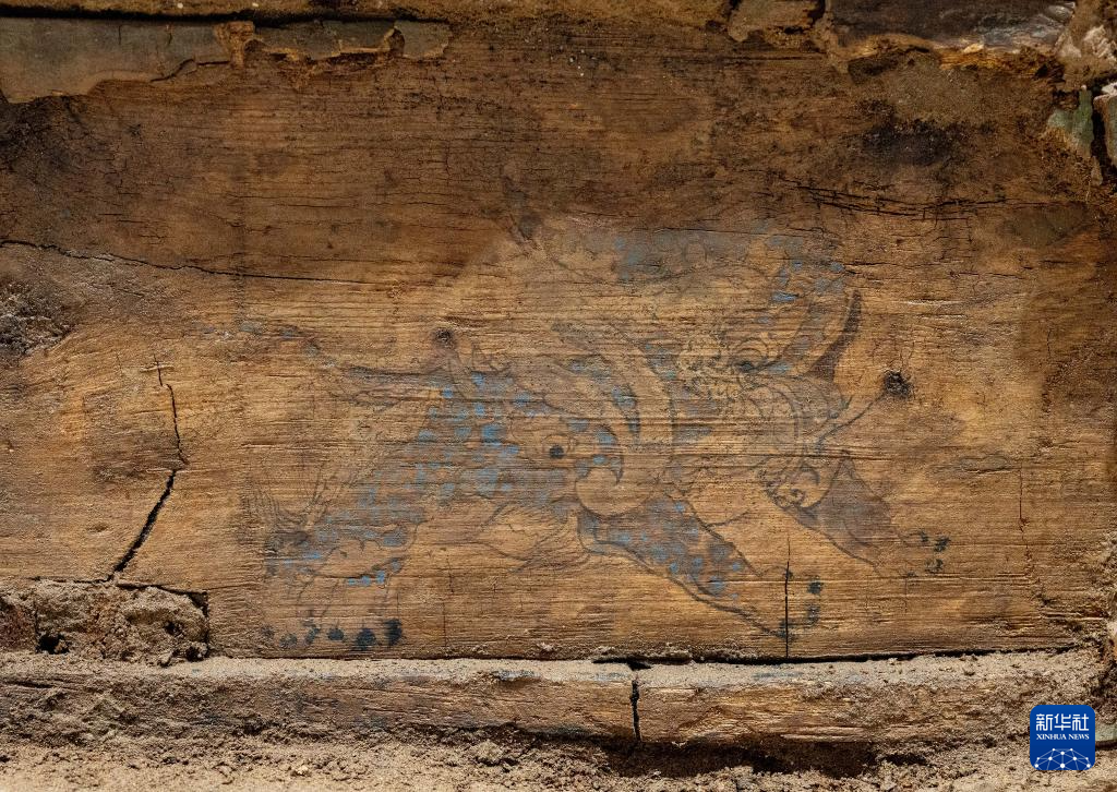 這是在實(shí)驗(yàn)室考古方艙內(nèi)拍攝的墓葬M20出土的木棺座壸門內(nèi)的彩繪“瑞獸”圖案(2月1日攝)。新華社記者 李賀 攝