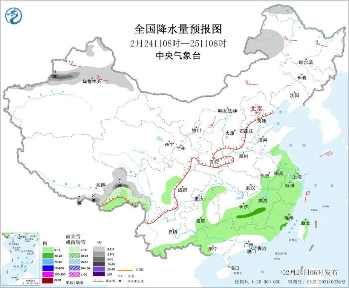 2月24日08時(shí)至25日08時(shí),內(nèi)蒙古東北部、黑龍江西北部、新疆北部、西藏東部等地部分地區(qū)有小雪或雨夾雪,其中,新疆伊犁河谷、西藏東部等地部分地區(qū)有中到大雪(5~9毫米)。江淮東部、江南大部、華南北部等地部分地區(qū)有小到中雨。內(nèi)蒙古、黑龍江、新疆北部和東部等地部分地區(qū)有4~6級(jí)風(fēng)。黃海南部海域、東海北部海域?qū)⒂?~7級(jí)、陣風(fēng)8級(jí)的東北風(fēng)。