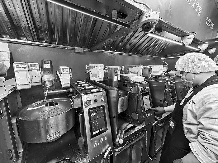 1月19日上午10點,在北京東城區(qū)長保大廈的七鮮小廚廚房里,一排4臺炒菜機(jī)器人,第一臺正在炒酸辣土豆絲。曾當(dāng)過廚師的趙奕軍, 現(xiàn)在的工作是操作炒菜機(jī)器人。只要輕點屏幕,就可以指揮機(jī)器人炒菜刷鍋。趙師傅還要給機(jī)器人打下手,比如備菜、出餐。