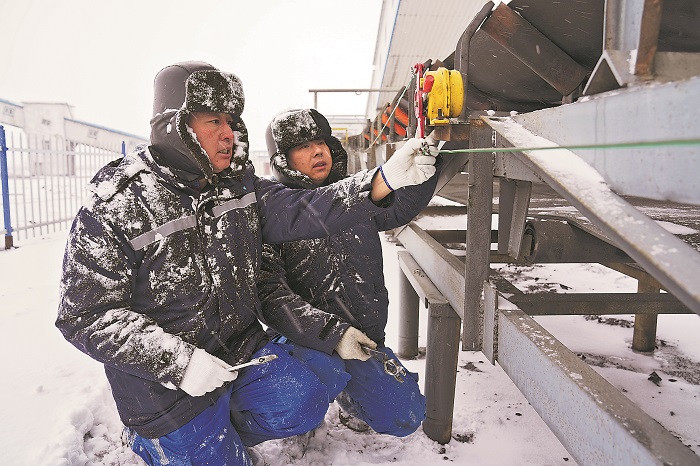 1月13日,大雪致中煤華利和翔公司別斯庫都克露天煤礦全面停產(chǎn)。該礦生產(chǎn)維修班在零下20攝氏度嚴(yán)寒中,冒雪開展坑下主皮帶運(yùn)輸系統(tǒng)維護(hù),現(xiàn)場更換拉繩保護(hù)裝置。李磊 攝