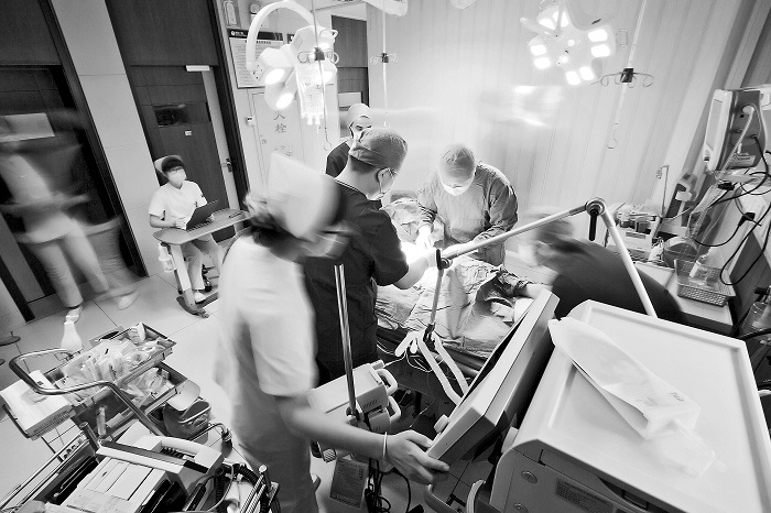 蔡倩茹點點頭,抓起旁邊的急救箱,準備陪同患者去做CT檢查。就在這時,又一名護士推門探頭說:“下一個病人兩分鐘后到,初步判斷是腦干出血,要準備插管?!蓖蹒魅銘艘宦?,順手拿出呼吸機放在旁邊的一張病床上做好準備。