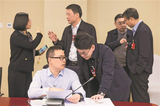 3月7日,上海代表團小組會議間隙,上海熊貓機械(集團)有限公司采購經(jīng)理李豐代表(前排左)、中核檢修有限公司焊接專業(yè)首席技能專家?guī)熝迂敶恚ㄇ芭庞遥?,圍繞特殊工種人才培養(yǎng)等話題交流。本報記者 吳凡 攝