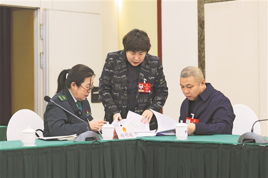 3月6日,在遼寧代表團(tuán)駐地,中國郵政集團(tuán)有限公司遼寧省大連市中山區(qū)寄遞事業(yè)部勝利橋普郵營業(yè)部攬投員趙明枝代表、遼寧昌華印刷包裝有限公司質(zhì)檢員劉桂梅代表、沈陽儀表科學(xué)研究院有限公司焊接高級(jí)技師王軍代表(從左至右)就“一線職工如何應(yīng)對AI技術(shù)所帶來的挑戰(zhàn)”進(jìn)行交流,建議相關(guān)部門出臺(tái)普惠政策,開展免費(fèi)技能培訓(xùn),普及實(shí)用技術(shù)和政策,共享AI發(fā)展成果。本報(bào)記者 王偉偉 攝