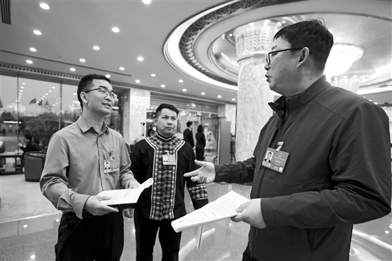 3月8日,烏江渡發(fā)電廠計劃發(fā)展部副主任鄭偉代表,中國郵政集團有限公司貴州省龍里縣分公司投遞員莫富元代表,南方電網(wǎng)貴州銅仁供電局變電智能作業(yè)班副班長、二級拔尖專業(yè)技術專家周敬余代表(從左至右),正在圍繞貴州省的發(fā)展進行交流。
