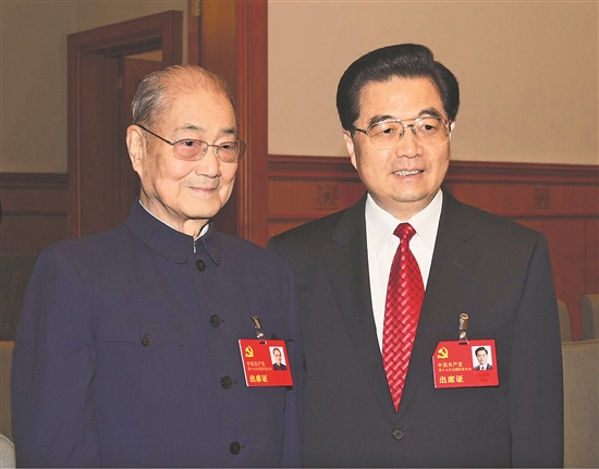 2007年10月21日,在黨的十七大閉幕前,胡錦濤同志同宋平同志在一起。新華社發(fā)