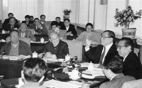 1991年4月,江澤民同志、宋平同志(前排左二)等與參加黨建理論討論會的代表座談。新華社發(fā)