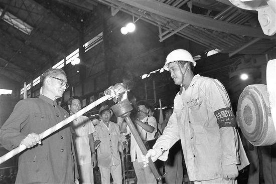 1985年9月15日,我國第一座日產萬噸鐵的高爐——寶鋼一號高爐點火試生產。這是宋平同志(左一)為高爐點火。新華社記者
