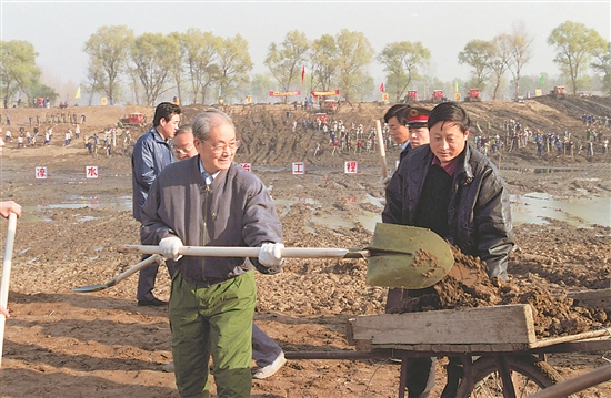 1991年11月13日,宋平同志(左)來到北京市通縣(今通州區(qū))張家灣涼水河整治工程工地參加勞動。新華社記者劉建國 攝