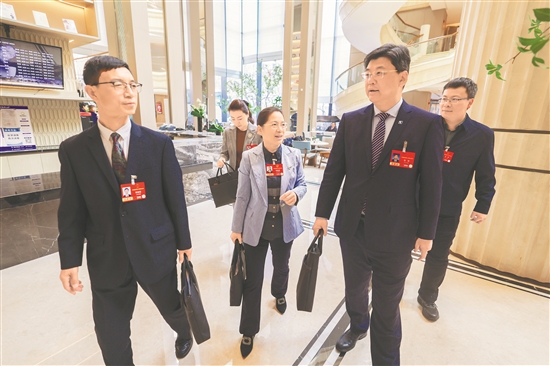 3月10日,在山東代表團駐地,東營市濕地城市建設推進中心職工張金海代表、中國鐵路濟南局集團有限公司信息技術(shù)所技術(shù)培訓室主任兼高級工程師邵麗麗代表、中國航空工業(yè)集團公司濟南特種結(jié)構(gòu)研究所研究員田俊霞代表、華能濟南黃臺發(fā)電有限公司總經(jīng)理助理欒俊代表、山東威達精工智能裝備有限公司精密機床工程師王亮代表(從左至右)在一起交流。
