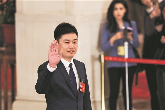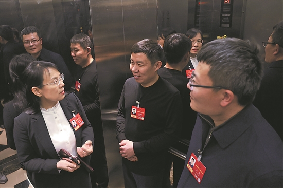 3月7日,山東代表團(tuán)小組會(huì)議結(jié)束后,山東豪邁集團(tuán)股份有限公司電火花科研小組組長(zhǎng)王欽峰代表(圖中)與同樣來(lái)自基層的王亮代表(圖右)和王雁代表(圖左)在電梯間討論高技能人才培養(yǎng)話題。