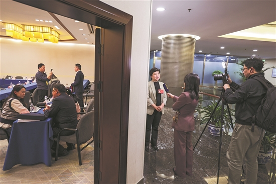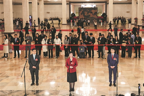 3月4日,媒體記者在人民大會(huì)堂采訪全國(guó)政協(xié)委員。