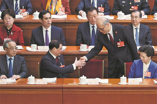 3月9日,十四屆全國(guó)人大四次會(huì)議第二次全體會(huì)議上,最高人民檢察院檢察長(zhǎng)應(yīng)勇(前排左二)與剛剛作完報(bào)告的最高人民法院院長(zhǎng)張軍(前排右二)握手。