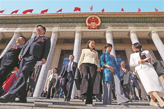 3月9日,十四屆全國(guó)人大四次會(huì)議第二次全體會(huì)議結(jié)束后,代表們走出人民大會(huì)堂。