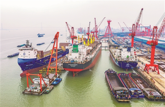 圖為在江蘇省泰州市高港區(qū)的泰州三福船舶工程有限公司生產(chǎn)基地,多艘大型船舶在建造中。