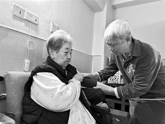 在頤康老年服務(wù)中心,馬亞明正在給妻子張碧玉測量血壓。本報記者 劉友婷 攝