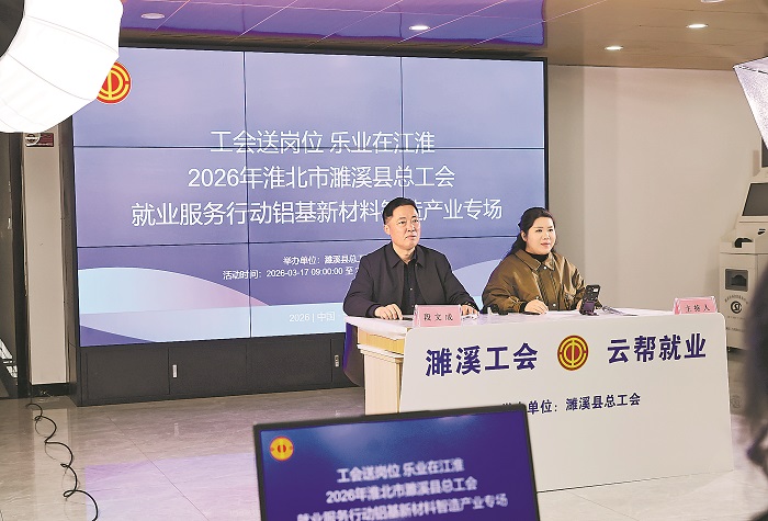 3月17日,安徽省淮北市濉溪縣總工會黨組書記、副主席段文成(左)走進直播間,為鋁基新材料智造產(chǎn)業(yè)帶崗引才。